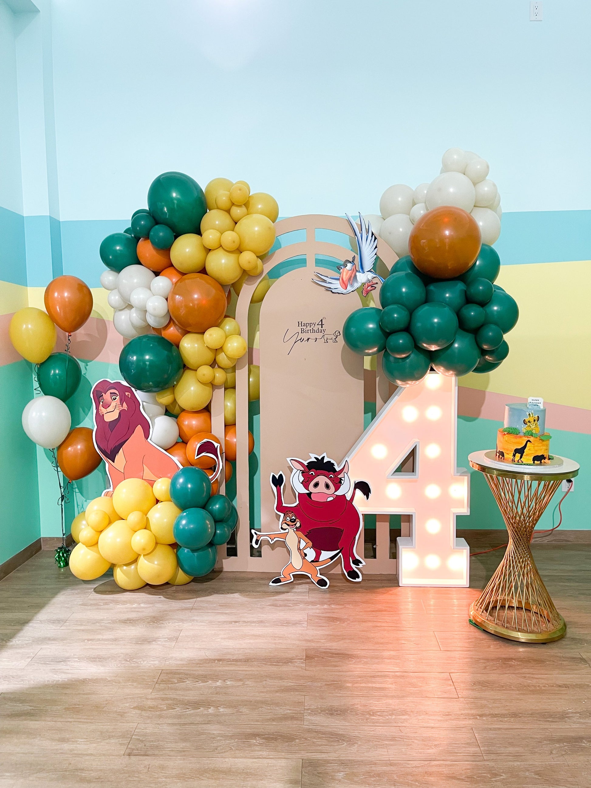 Works with any theme! 1 backdrop rental with a custom message, balloon garland styling, 1 marquee letter or number rental, 1 cake stand 1 helium bouquet and matching cutouts to bring your theme to life!